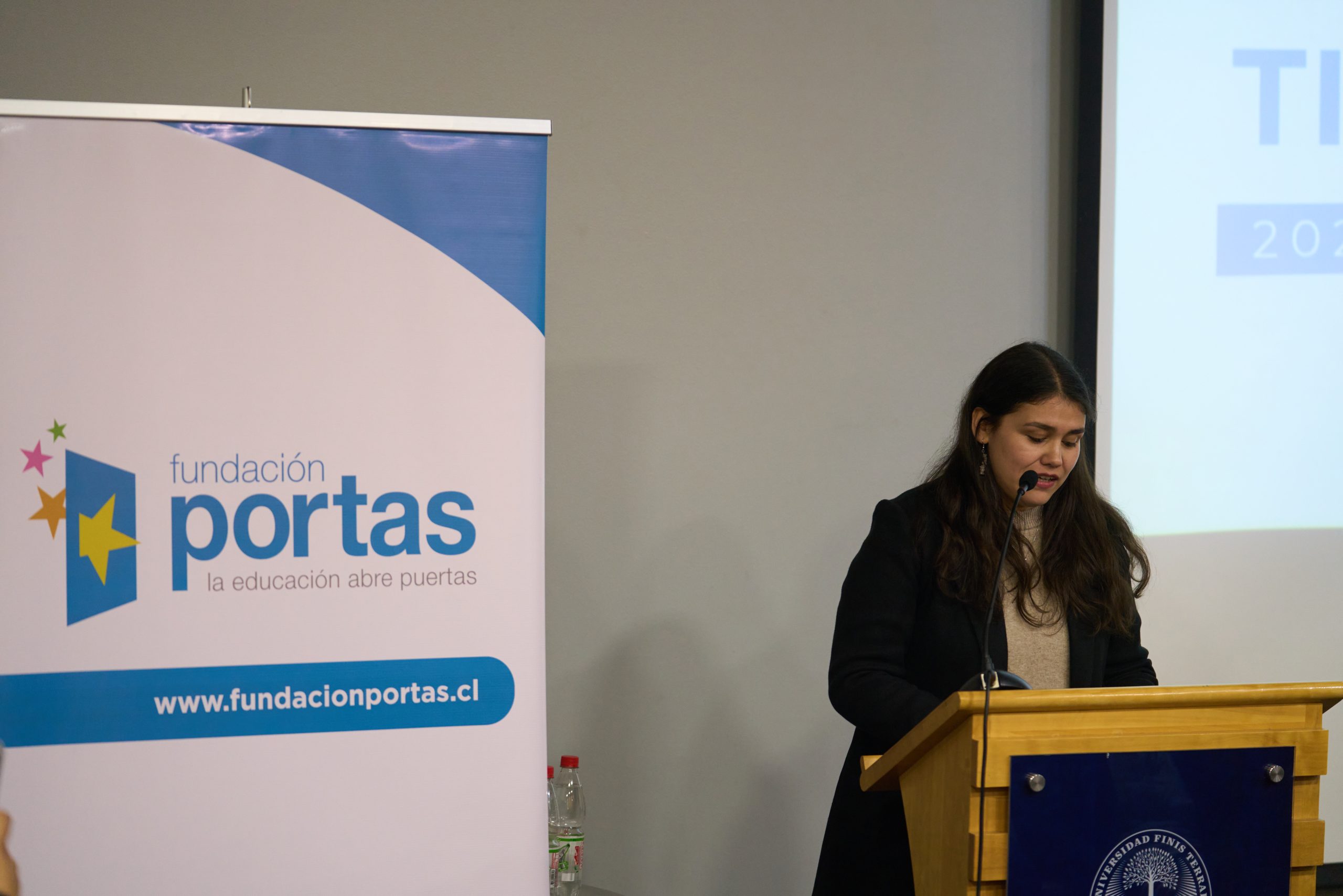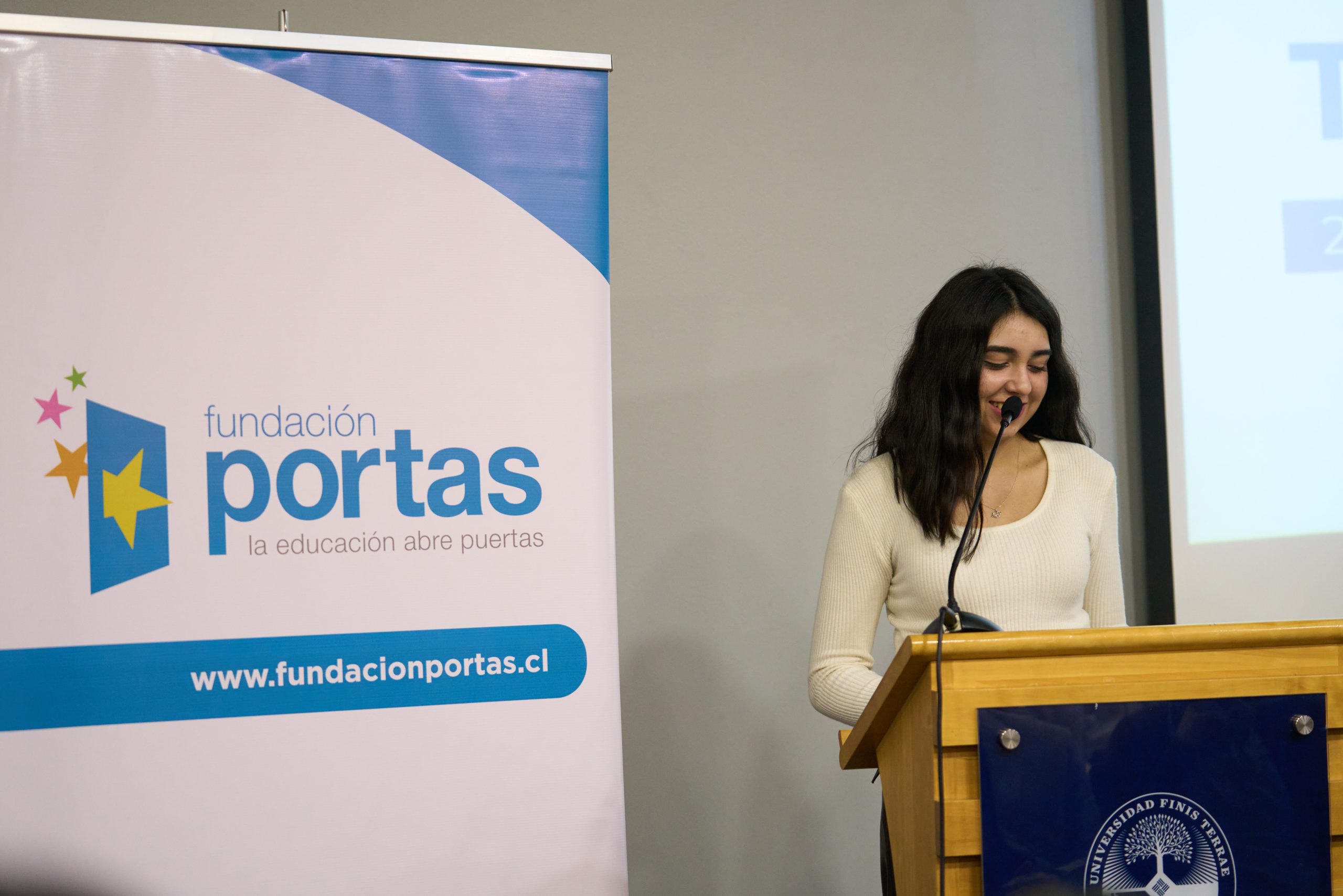 Luego fue el turno de Nicol González, titulada del programa Abriendo Futuro de Fundación Portas sede RM y abogada de la Universidad Finis Terrae, quien comentó: “Muchos de nosotros probablemente vio este día muy lejano. Pero aquí estamos, logramos vencer distintos obstáculos, como las dificultades económicas, vulnerabilidad socioeconómica, falta de oportunidades, brechas académicas, falta de redes de apoyo y un sin fin de cosas que podría nombrar, pero lo importante es que logramos vencerlas y comenzamos a construir nuestro proyecto de vida del que tanto hablamos y escribimos en nuestras agendas personales. A todos les digo ¡se puede!”