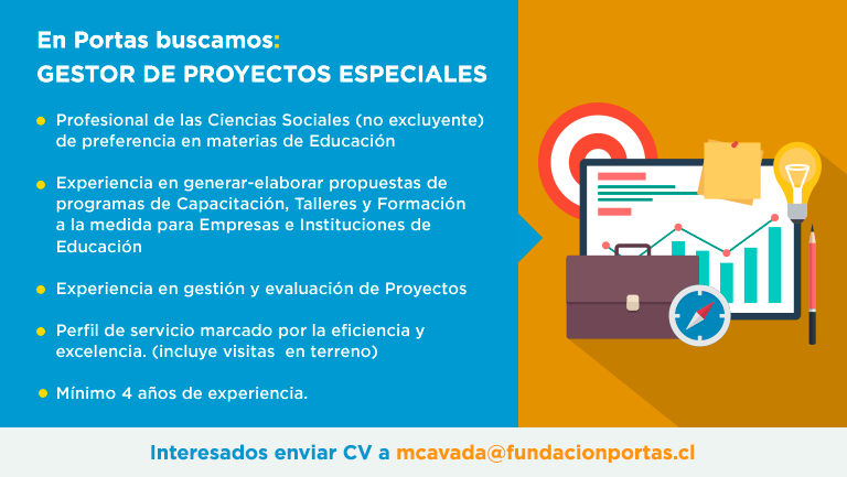 Fundación Portas necesita en su equipo a un Gestor de Proyectos Especiales. El cargo reportará directamente del Jefe de Proyectos Especiales y tiene como objetivo principal generar nuevas oportunidades de negocios manteniendo contacto directo con clientes actuales, y asegurar la entrega de un servicio eficiente y de calidad.