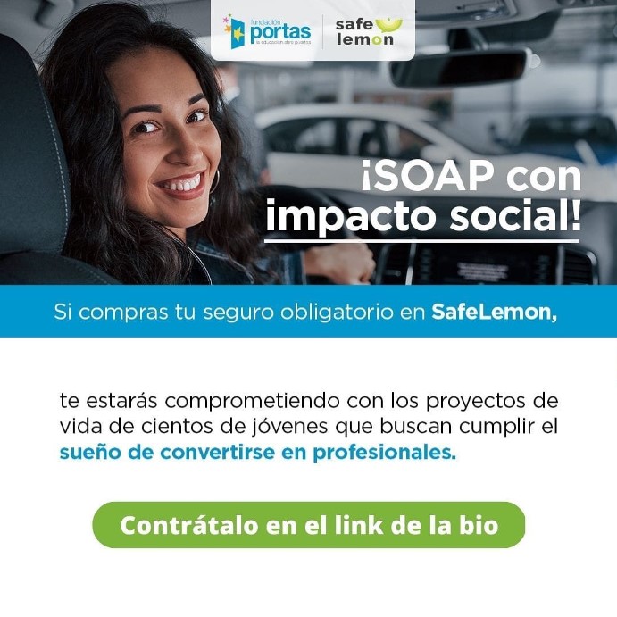 ¡Contrata tu #SOAP 2023 con Safe Lemon y Fundación Portas! Al adquirir tu seguro obligatorio aquí estarás ayudando a cientos de becados Portas. Comparte con tus amigos y familiares y se parte de nuestro propósito.